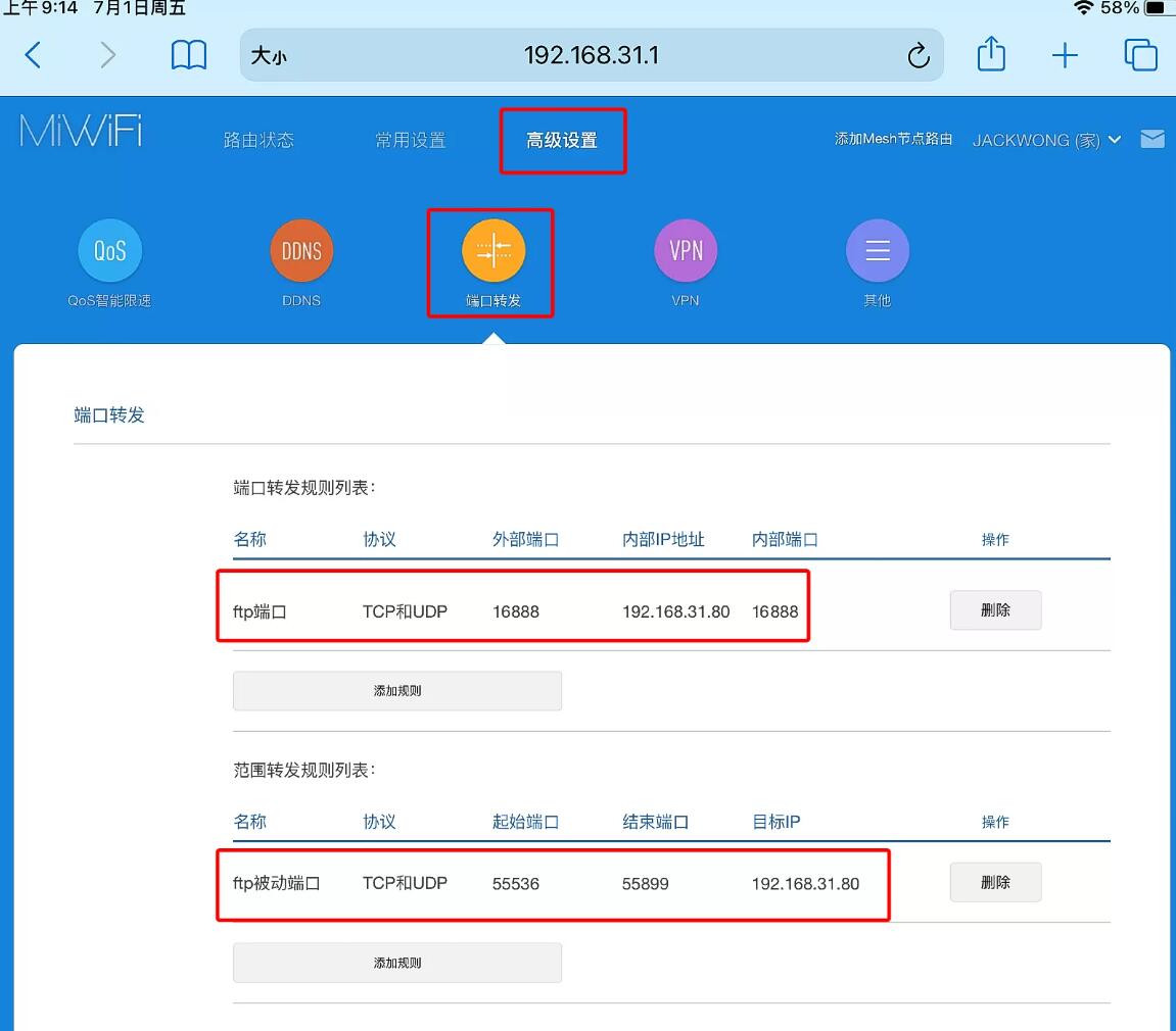 从上文图1可以看到,NAS的FTP的被动式端口是55536-55899,那么,我们就需要在路由器把端口转发出去。